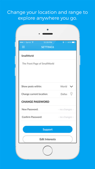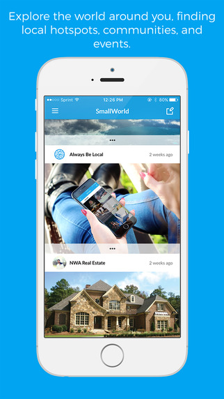 Let SmallWorld change the way you live locally and travel abroad. Connect to what excites you in seconds by choosing your interests and flipping through our suggestions. Promote your local business, event, community, hotspot, or passion.